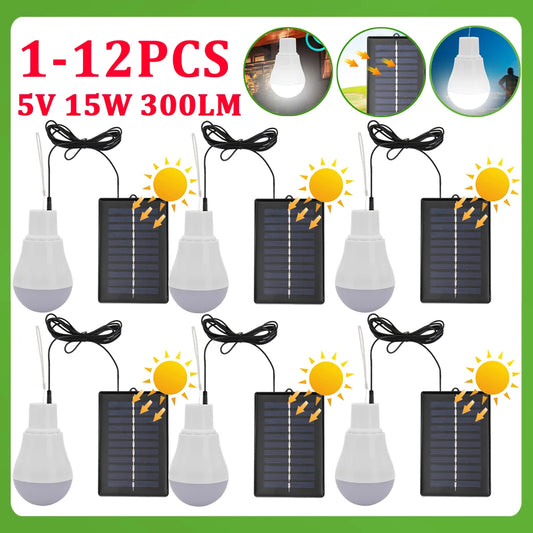 1-12pcs 5V 15W 300LM Solar Lighting Bulb Portable Solar Power Panel Battery Charger Energy Saving Outdoor Lamp USB Rechargable