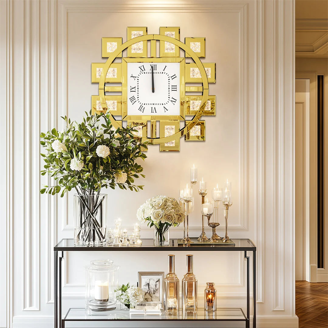 【Luxurious Wall Clock】The meticulous fusion of silver/ gold crushed diamonds and glass frame in this wall clock creates a truly opulent and embellished look, elevating its aesthetic appeal to new heights, gives a touch of luxury to any spaces, making it stand out from traditional clocks, adding a distinctive touch to home interiors decors, while the incorporation of Roman numerals appeals a timeless classic look, sure to catch the eye of anyone who enters the room