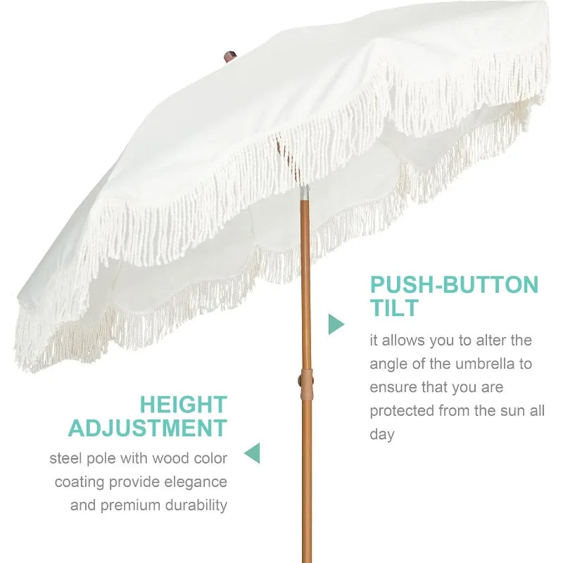 - ☂ Tassel design umbrella will add a fresh look and unique appearance to your beach or outdoor moment. Ideal for the beach, patio, backyard, lawn, pool, and garden.