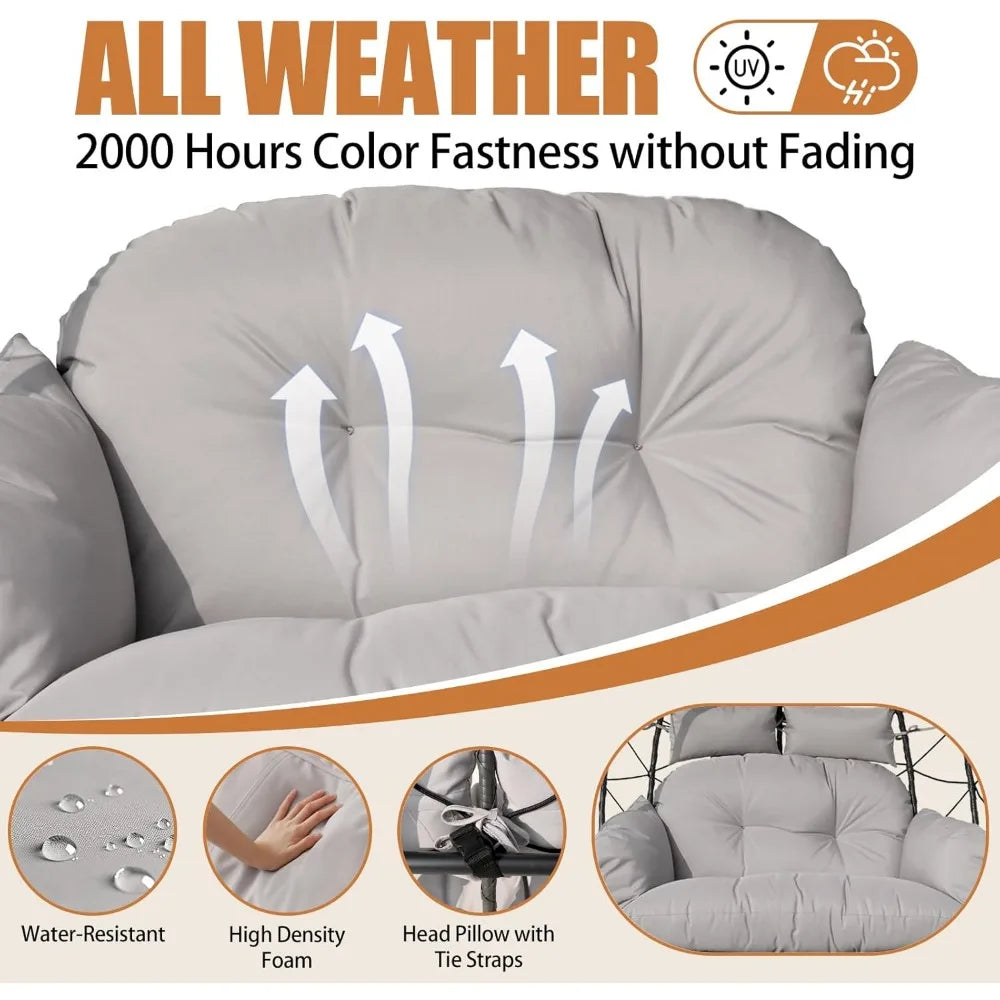 - 【Sturdy & Spacious Design for Two】Crafted with a heavy-duty steel frame and handwoven all-weather PE rattan, this oversized swing chair supports up to 680 lbs. The dual-seat design offers ample space for couples or families to unwind together.