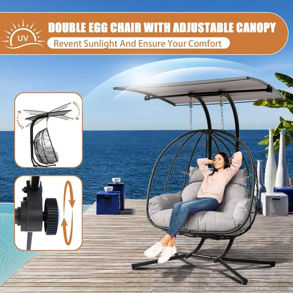 - 【Adjustable Canopy for Sun Protection】Enjoy shade anytime with the double egg chair's adjustable canopy, designed to block harmful UV rays while you relax. Perfect for sunny days in the garden, patio, or poolside.