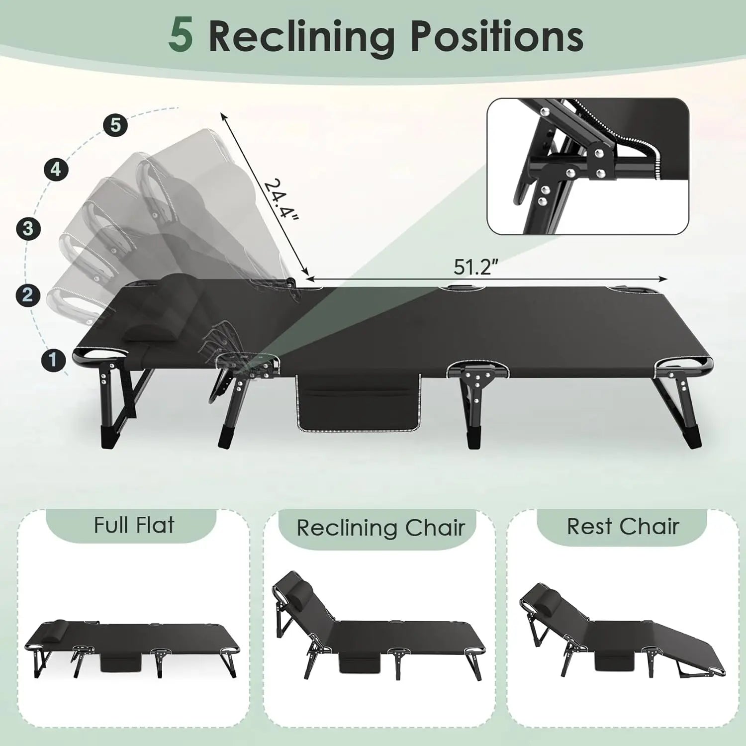 5-Position Adjustable Backrest-- Folding cot bed are typically designed for exceptional comfort, offering a pleasant seating and sleeping experience. The backrest can be adjusted to 5 different positions, ensuring optimal comfort and support. Equipped with soft cushions and pillows, the cushions weigh 4.44lbs and have a thickness of 3.9 inches. Cushions can be easily detached, guaranteeing that users can enjoy a comfortable experience in various use scenarios.