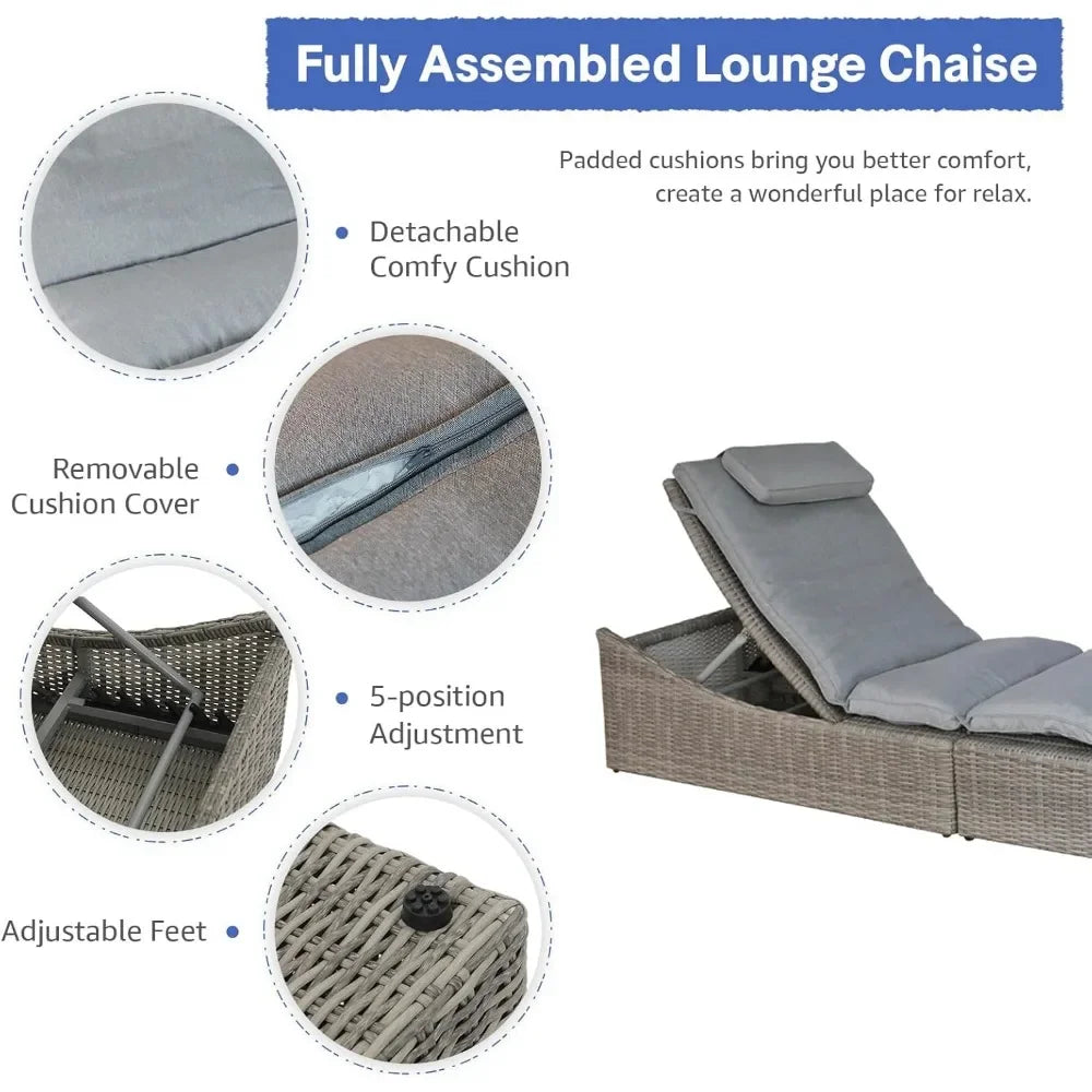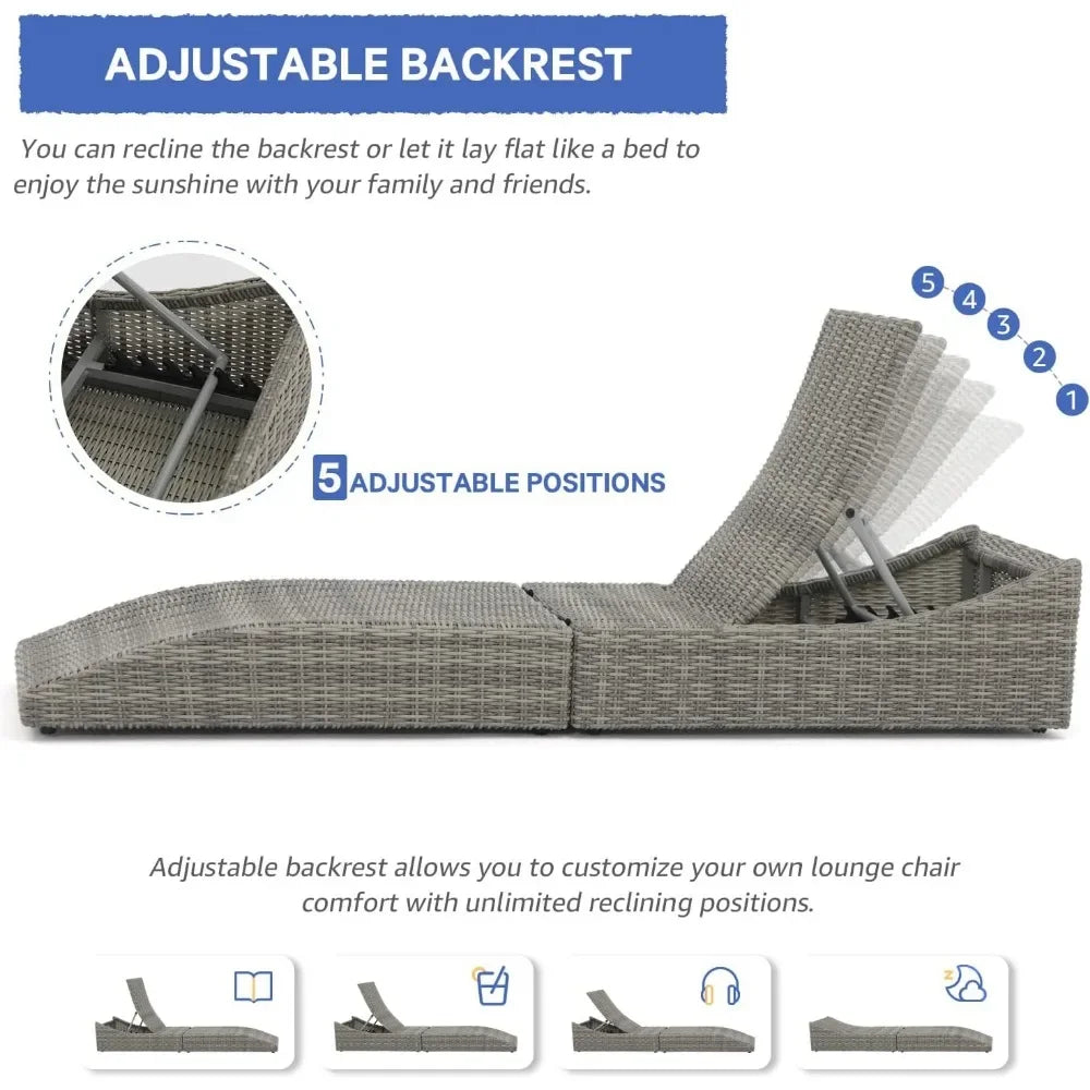【ADJUSTABLE BACKREST】: The pool lounge chairs are a perfect spot for relaxing, reading, or soaking up the sunshine. With five reclining positions, you can find the chaise lounge outdoor a good way to make yourself comfortable. The included dark gray cushion rounds out the design, providing padding as you kick back and unwind.