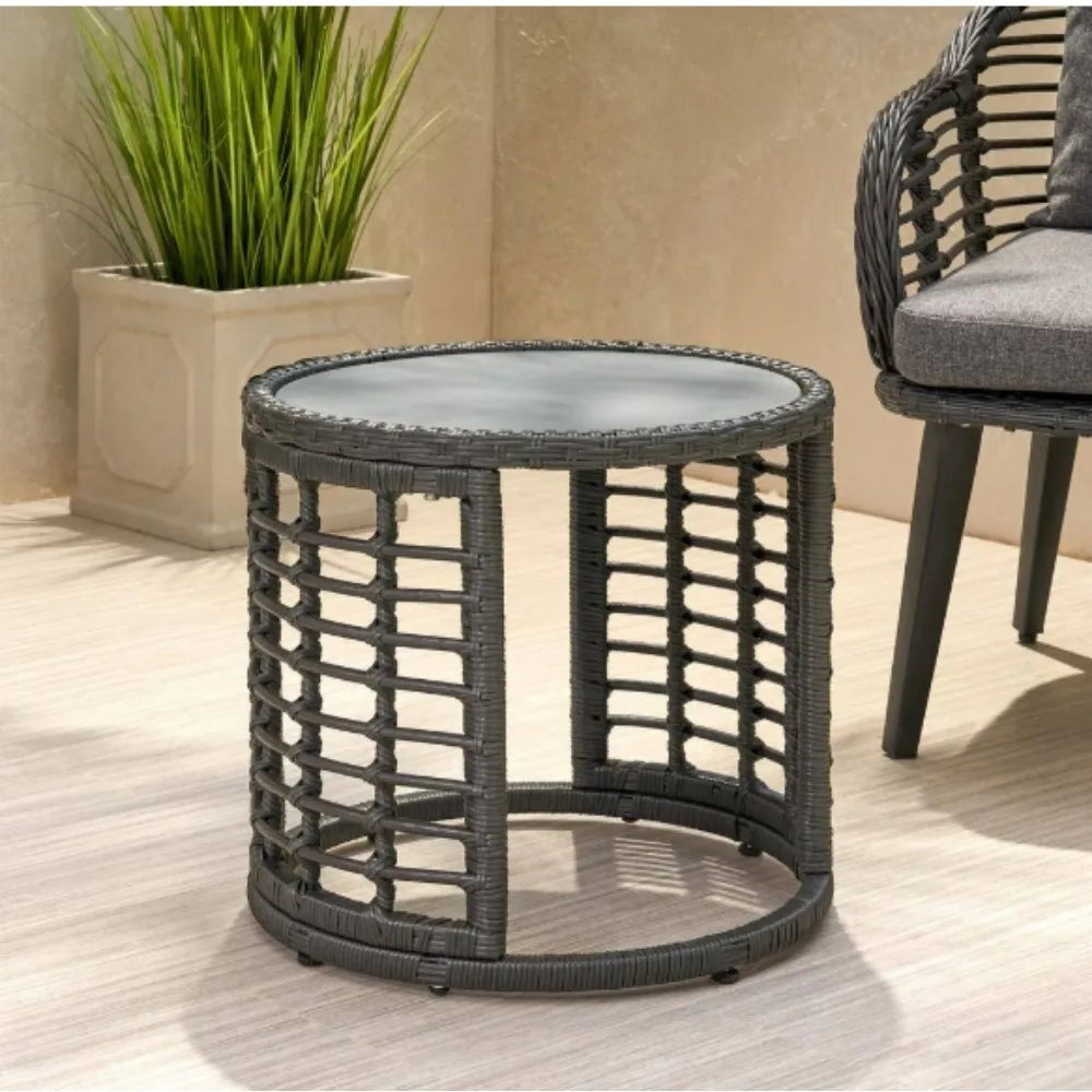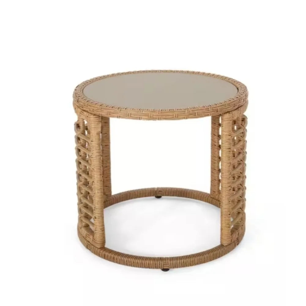 Round Faux Rattan Outdoor Patio Side Table with Tempered Glass Top for Patio, Graden, Backyard and Poolside, Weather-Resistant