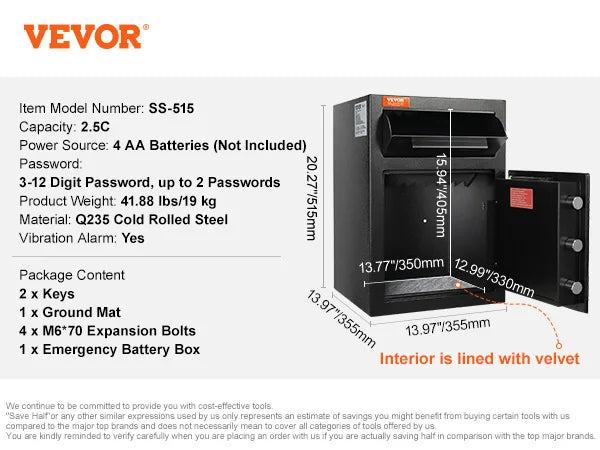 1.7/2.5C Safe with Drop Slot: With a spacious 1.7/2.5C capacity and external dimensions of 13.77"(L)x11.81"(W)x17.71"(H)/20" (L) x 13" (W) x 13" (H), this depository safe is ideal for storing your essential documents, jewelry, coins, photos, and other valuable items. The front-facing drop slot simplifies cash and document deposits without the need to open the door.