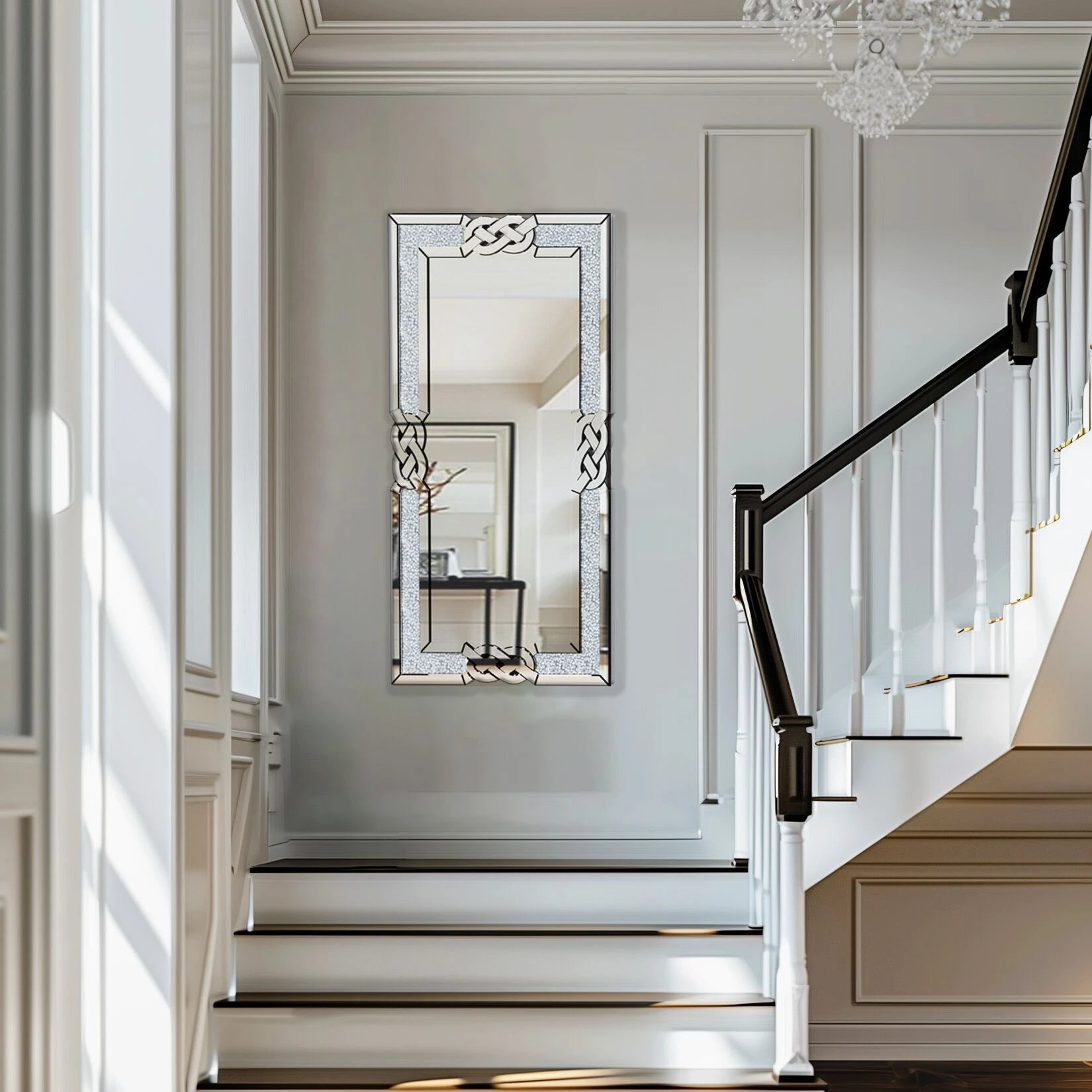 Introducing the Wisfor Crushed Diamond Wall Mirror, a stunning addition to any space that beautifully blends elegance and functionality. This rectangular glass vanity mirror is adorned with a decorative glam bling crystal frame edge, capturing and reflecting light to create an enchanting atmosphere.
